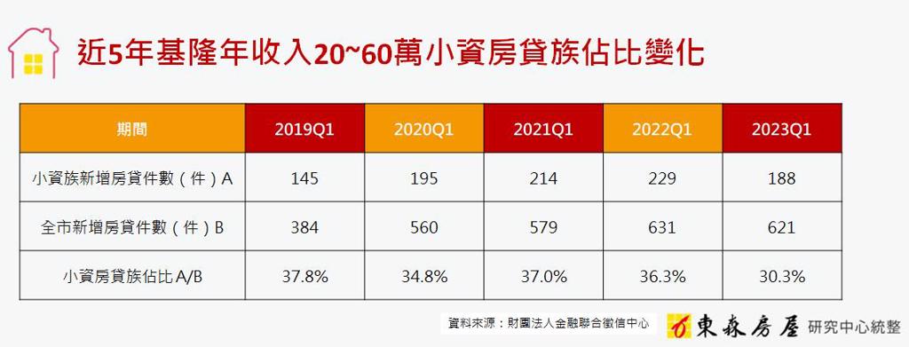 基隆房價在北台灣相對偏低,不過近年台房價飆漲,基隆購屋民眾的壓力也隨之加重。由聯徵中心資料揭露,今年Q1基隆年收入在20~60萬之間的小資房貸族佔比僅為30.3%,是有統計數據以來的同期新低,而且與2019年Q1的37.8%相比,大幅減少了近8個百分點,顯見基隆小資房貸族的買房難度正在快速攀升。