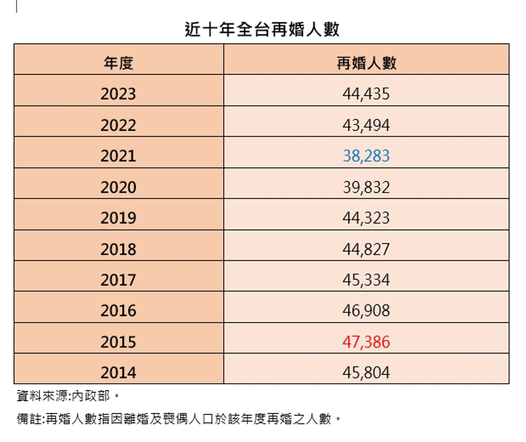 張旭嵐指出,觀察近10年再婚人數,再婚人數最高的是2015年47,386人,2020~2021年是疫情最嚴重的時刻,因此多數經濟活動或計畫都被打亂,因此2020和2021年再婚人數都不到4萬人,其餘各年再婚人數在4.3~4.7萬人之間。