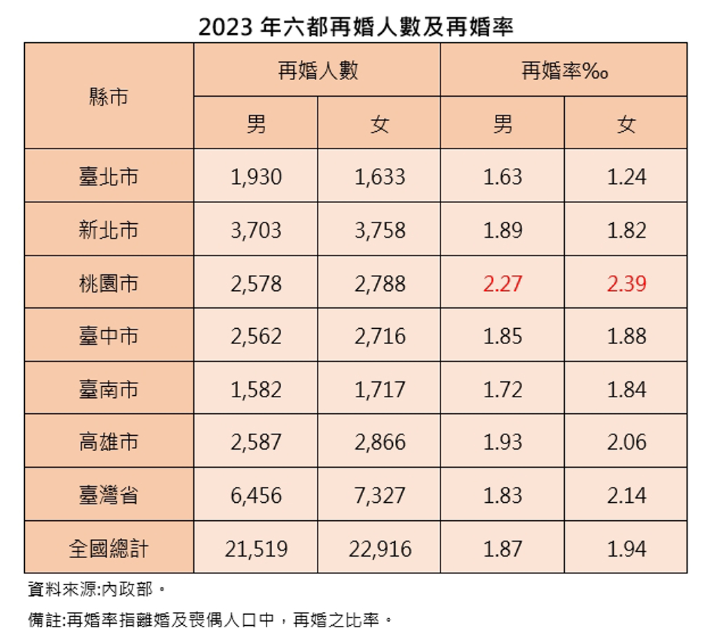 大S猝逝留下遺憾,兩段婚姻及遺產繼承成話題。依據內政部最新資料,2023年台灣離婚及喪偶人口的再婚率,男性為1.87‰,女性達1.94‰,全年再婚人口總計44,435人。進一步觀察六都狀況,再婚率最高的是桃園市,男性2.27‰,女性2.39‰。不過,雙北女性再婚率低於男性,而桃園以南四都,女性再婚率則高於男性,男性再婚狀況也比北部高,反映出再婚意願和狀況也有南北差異。