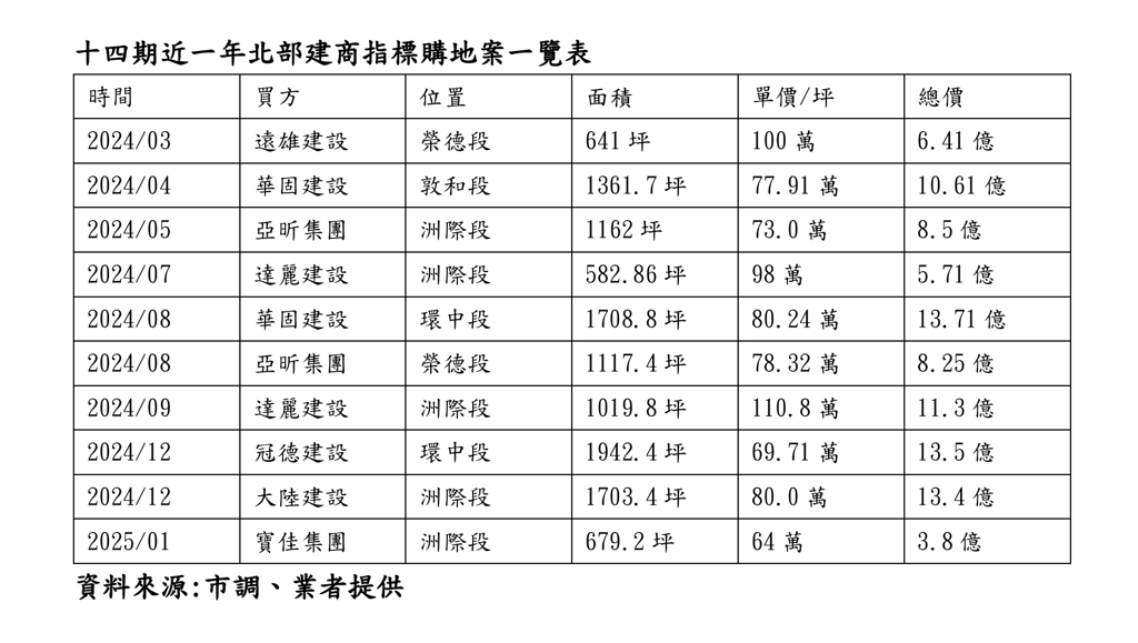 在購地方面,北部大型建商如達麗、亞昕、華固於一年內二度購地,遠雄、冠德、大陸、寶佳等亦持續加碼,過去一年合計購地面積達1.2萬坪,總金額近百億,顯示建商對十四期未來發展的高度信心。